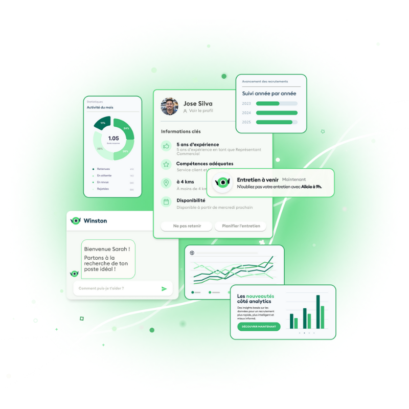 De Winston, notre couche d'intelligence IA, à SmartOS, notre système d'exploitation des talents, en passant par nos modules complémentaires qui enrichissent la plateforme, vos équipes seront équipées pour attirer, sélectionner et recruter les meilleurs talents au bon moment.